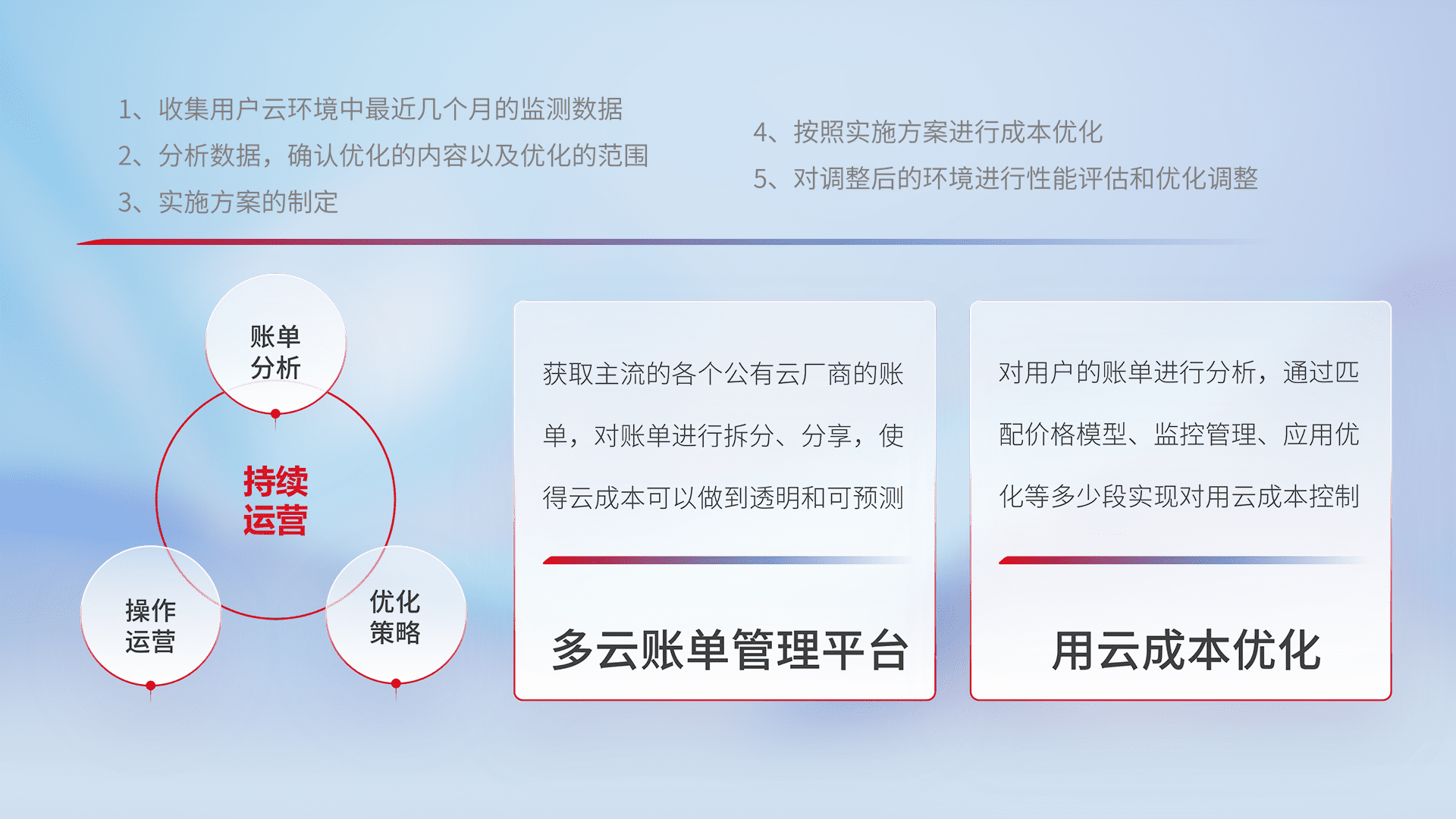 通过多云纳管,,,以统一的资源数据模型把客户的云资源进行抽象和封装,,进而实现对多云资源的统一操作,,保障云资源管理的可靠性、、、、稳定性与可用性。。量身定制化运维内容,,配置、、、开发运维、、补丁管理、、、、备份、、、监控、、认证和访问管理、、、审计和日常巡检等,,保障在用云过程中的可靠度,,,稳定度以及高可用率。。。。